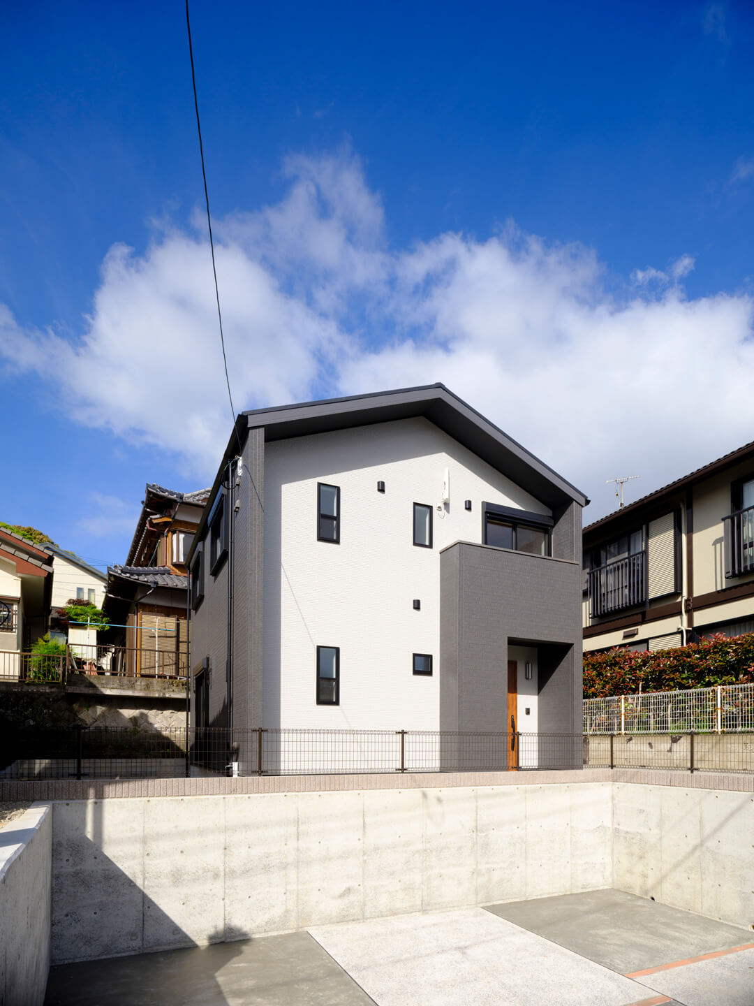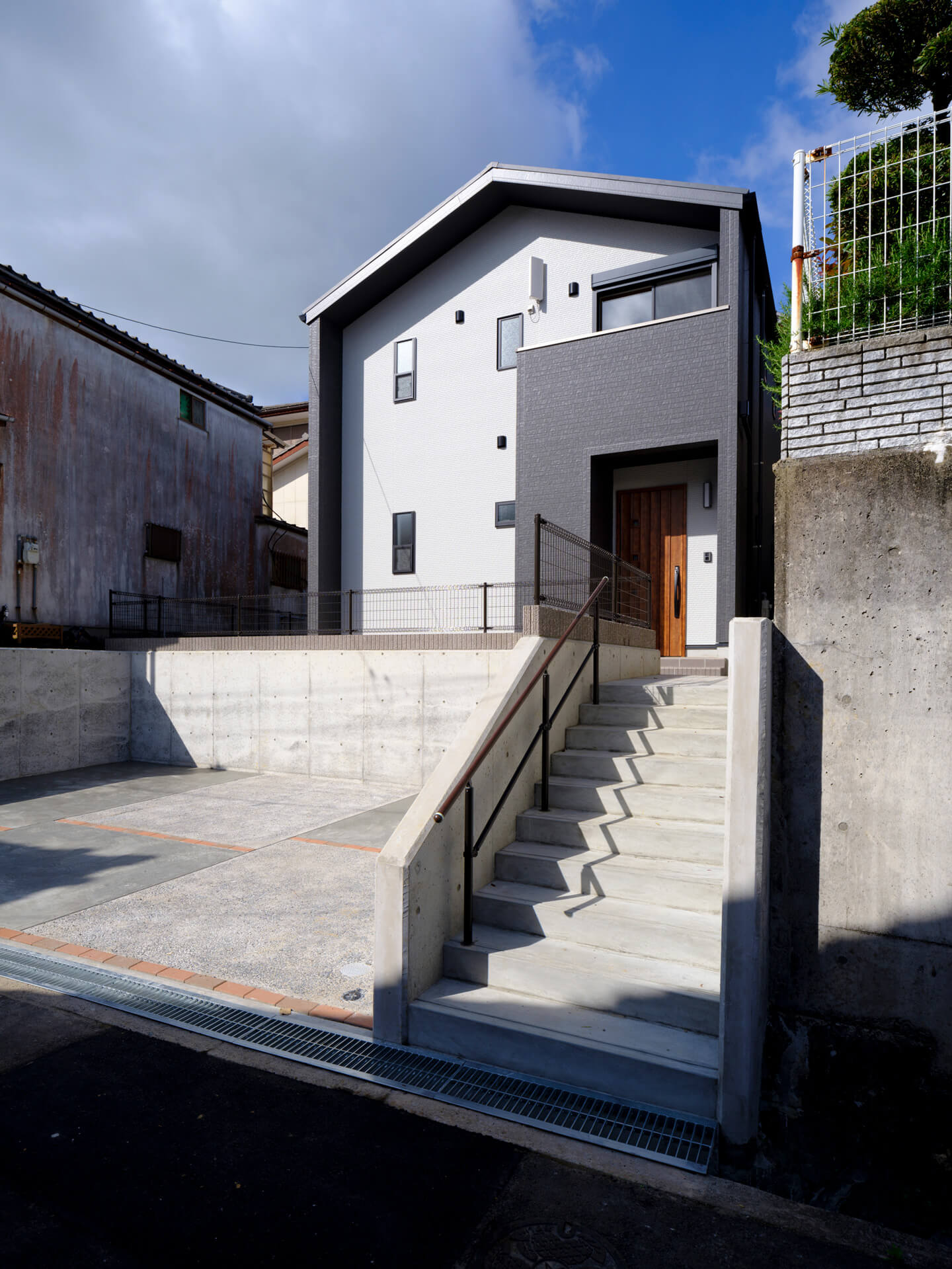 道路と接する敷地の一部をくり抜くようにしてつくる掘車庫。道路より上がった土地、いわゆる「ひな段」の土地に駐車場を造成する場合に使われる手法で、斜面地が多い長崎市内でよく見かけるスタイルです。売地として出ていても、車庫スペースに十分な大きさがなかったり、補強が必要だったりと、造成工事の期間やコストがかなりかかってしまいます。さらに、駐車場の配置によってプランニングが制限されるため、ハウスメーカさんもなかなか手を出しにくい案件でもあります。このひな段の土地を気に入っていただいたOさま。これまで道下や道上での家づくりの実績とノウハウを積み重ねてきた弊社ならお役に立てるのではないか、そんな想いからこのお家づくりがスタートしました。