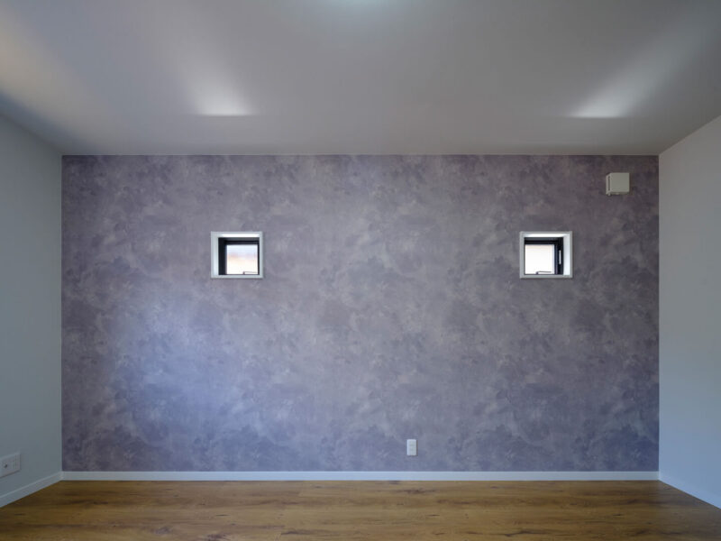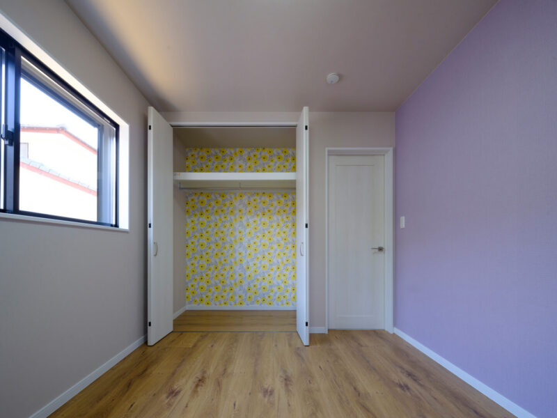 外観同様、家の中もシンプルモダンに。O邸で参考にしていただきたいのは、メリハリのある色づかい。部屋全体の印象を決めるフローリングを1階と2階で使い分けています。家族以外も招き入れるLDKを配した1階はワイルドホワイト柄を採用。最大の特徴はその明るさ。クロスやドアなどの建具も同色系でまとめることで、家の中に入ってきた穏やかな光がほどよく拡散し、空間を広く見せてくれます。一方でプライベート空間をレイアウトした2階はブラウン系のワイルドオーク柄。落ち着きのある色味が、少しムラ感のあるグレーの石目調やブルーが目を引く木目調、鮮やかなイエローの花柄など、個室に配したクロスの遊び心をぐっと引き立ててくれます。一見難しそうなアクセントクロス選びも楽しみながら。