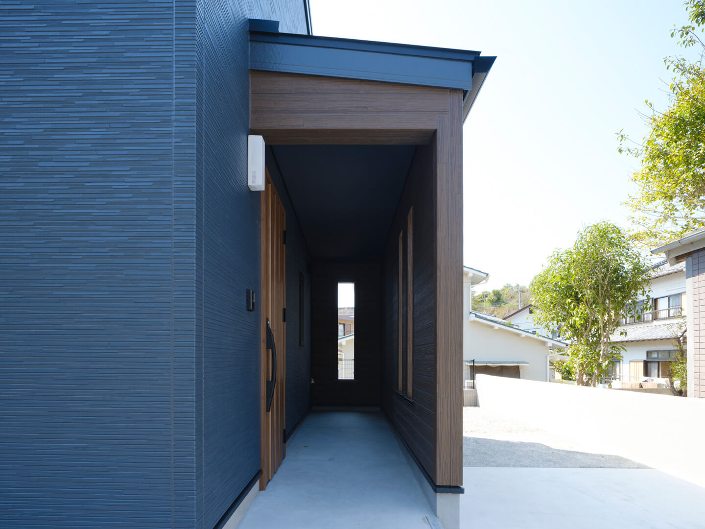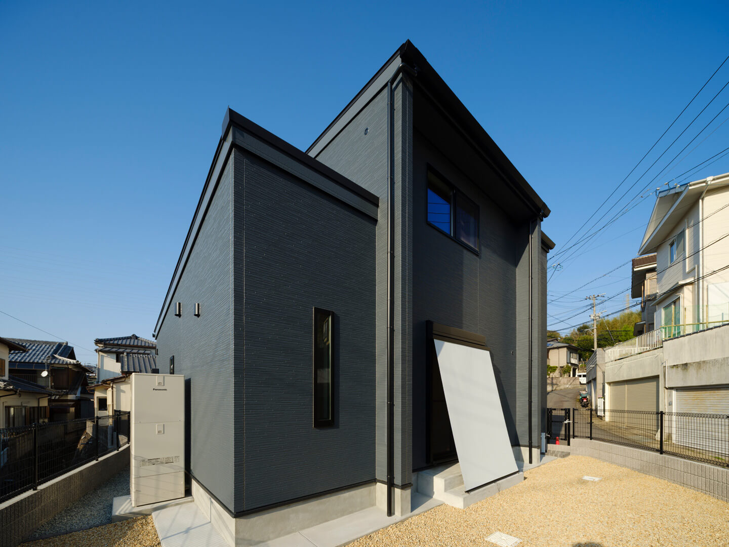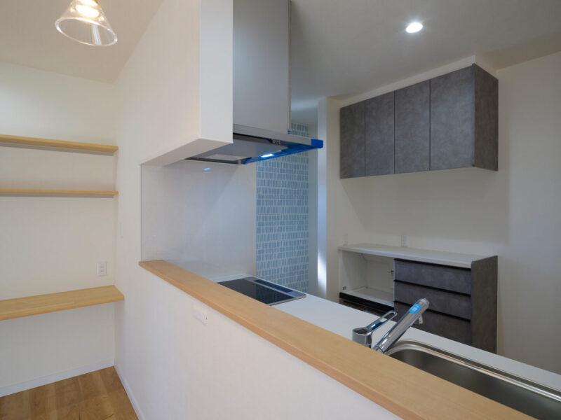 まず目を引くのは存在感を放つブルーグレーの外観。建物全体がぐっと引き締まり、くっきりとシャープな印象に。単色だと重くなりがちですが、アクセントとして木目を入れ、玄関まわりにポイント使いすることで抜け感をプラス。さらに正面に配した窓の縦ラインが重厚感のある外観にリズムを添えています。Hさま邸が建つのは隣家とほどよい距離を保つ、日当たりがとてもいい場所。屋根には太陽光パネルをのせ、蓄電池を設置しています。余った電力を蓄電池にためて賢く電気代も削減。初期費用はかかりますが、値上がりが続くこのご時世。電気代のコストを抑えられるうえに、万が一の際の非常用電源になるのが大きなポイントです。Hさまが将来を見据えて選び抜いた、このお家のハイライトでもあります。