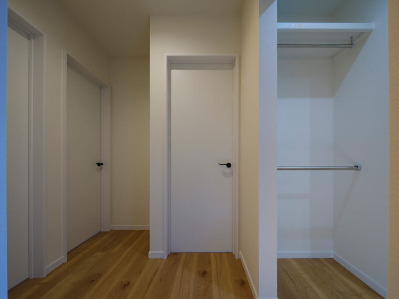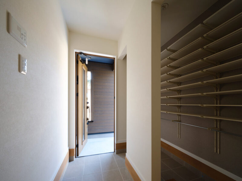 新しい家での新しい暮らし。できれば生活感はそっとしまいたいもの。そのためH邸では収納スペースを適材適所にレイアウトしています。まず玄関の横には2方向から出入りできるシューズクローゼットを。可動式の棚に加え、ハンガーパイプも設置。かさばりがちな傘を掛けたり、高めの位置に組み替えてカート掛けなどにも使えたりと、何役もこなせる万能アイテムです。キッチン奥にはアクセントクロスがかわいいパントリーもあります。さらに2階にはウォークインクローゼット。H邸では主寝室に併設したうえで、主寝室→ウォークイン→廊下、とぐるりと回遊できるから移動がスムーズに。しかも、その動線上の両サイドにオープンクローゼットを配置してるので、通り抜けながら着替えができてしまう便利さです。動線の効率性と収納の利便性を兼ね備えたつくりにはHさまのこだわりと工夫が詰まっています。