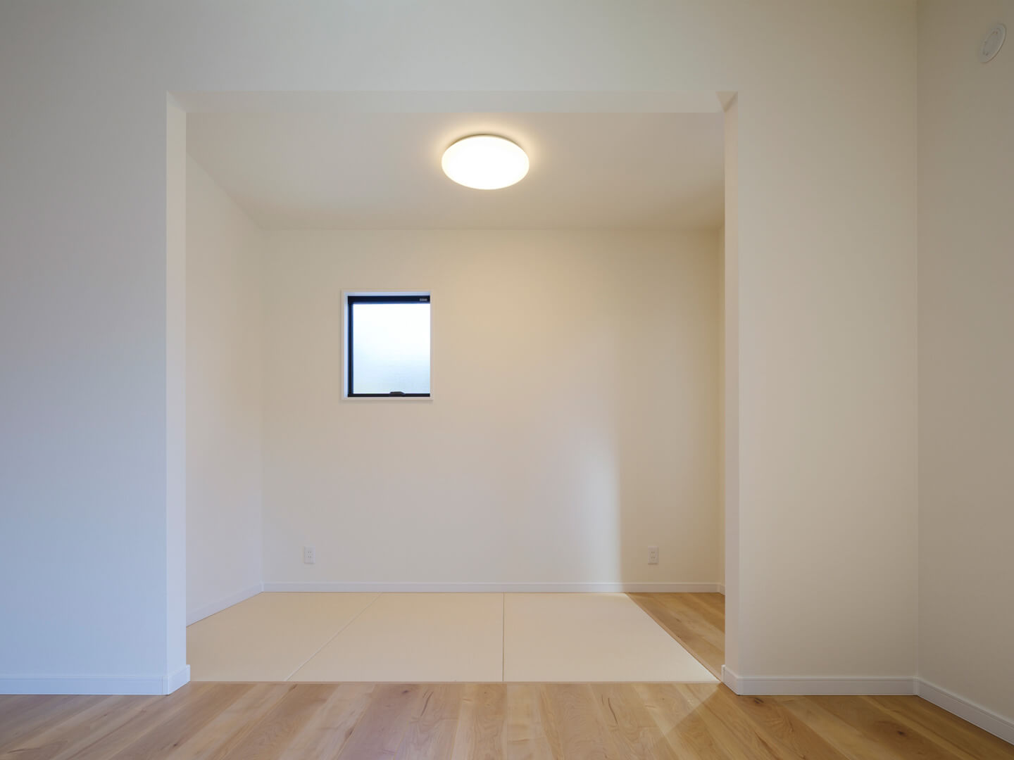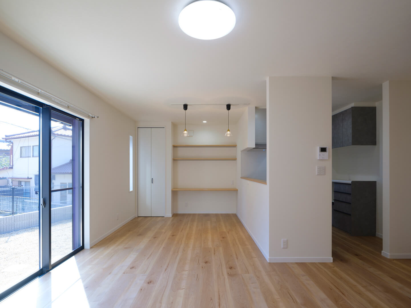 やわらかな光を招き入れるLDKは家族みんなが過ごす場所。だからこそ、こだわりがいっぱいです。リビングとつながる和室は、フローリングと畳の段差をなくして連続した空間に。引き戸をなくしたことで、視覚的も広く明るく。食後にごろんと寝転んだり、子どもの遊び場になったり。和紙畳を採用しているので、洋の雰囲気にも違和感なくなじみます。またキッチンから目が届く位置にスタディスペースを確保。仕切りのないオープンな造りにすることで、お子さんの様子を見ながら料理ができるように。将来、子どもが巣立ったあとは書斎やワークスペースとしても使えます。