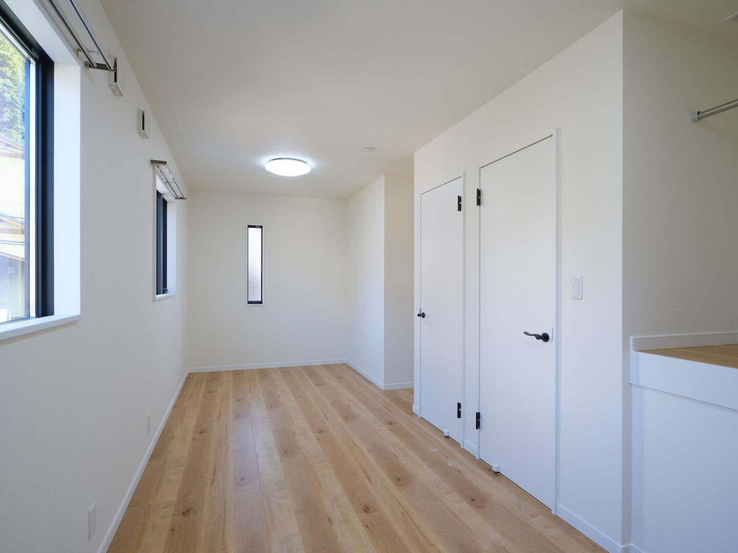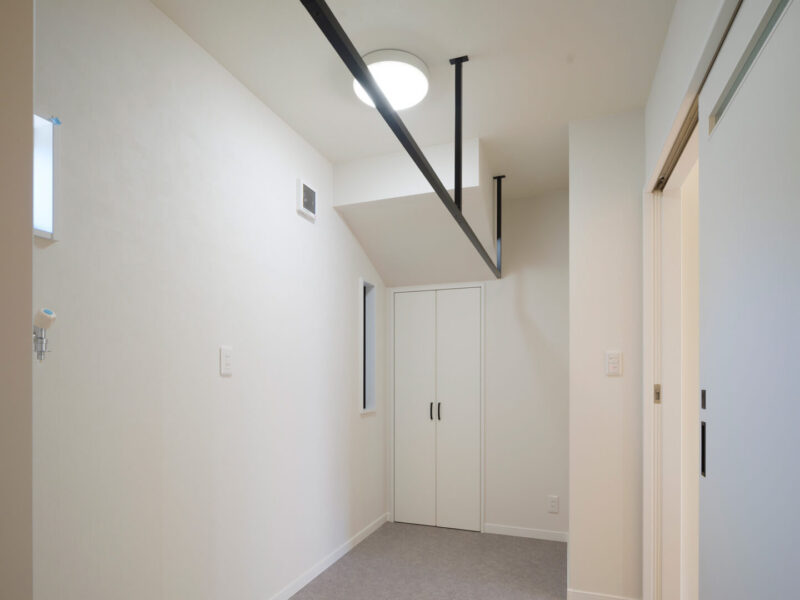 ウォークインクローゼットと並び、お客さまからのリクエストが多いのが天井から吊り下げるランドリーポールの設置。花粉や黄砂など気象状況に左右されない室内干し派が増えたこと、バルコニーを取り付けることが減ったこと、などがその理由です。省スペースで設置でき、空間デザインのじゃまにもなりません。洗濯ものを洗って、干して、取り込んで、たたんで。一連の動きがスムーズにおこなえるため、家事時間の短縮にもつながります。そこにランドリールームもプラスすれば、しまう作業も一か所ですむように。間取りなどを工夫することで、日々の家事がラクになるお手伝いもできます。